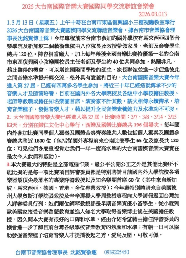 2026大台南國際音樂大賽國際同學聯誼交流音樂會新聞稿
